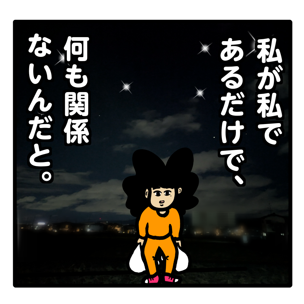 【ふと思う】私が私であるだけで、何も関係ない。 デコボコ劇場! 2026.03.10 スポンサーリンク 深夜の誰もいない外の空間に、私ひとり、ここに居る。 日常は、常に何かであらないと存在できない感覚や、 本当にどうでも良いようなことに囚われ続けていたりするけれど、 本当は、私が私でいるだけで、それ以外は何も関係ないんだよね。 そんなことをふと思う、深夜のゴミ出しでした。