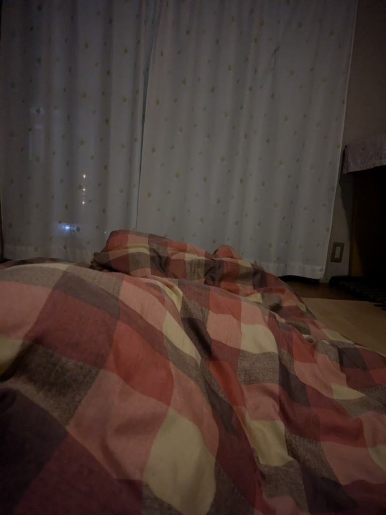 寝相が悪い母、布団から45度はみ出してグースカ。