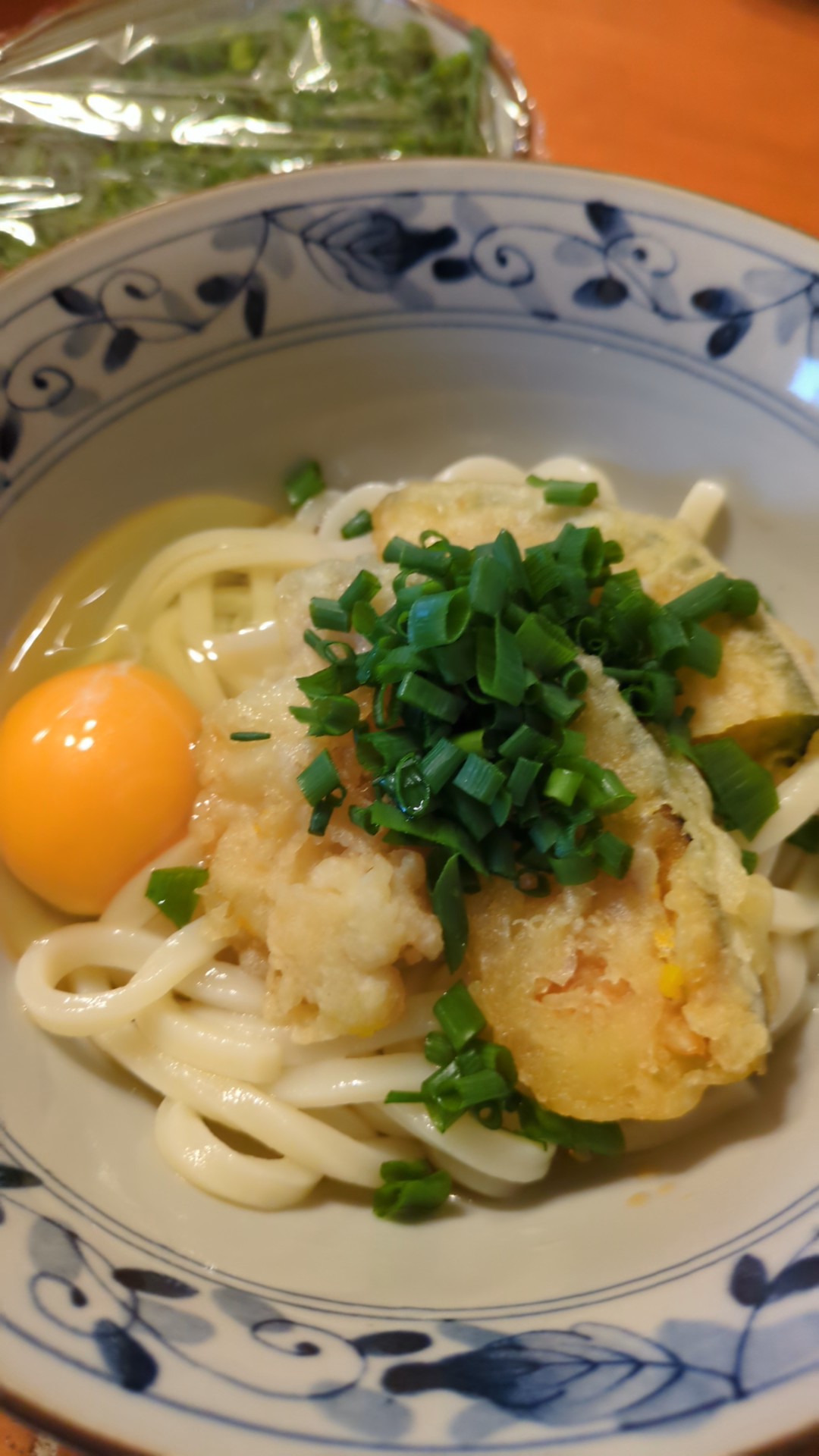 昨日、スーパーの半額でゲットした天ぷらを乗せて、たろが刻んだネギをかけたぶっかけうどんが今日の昼ご飯↓✨