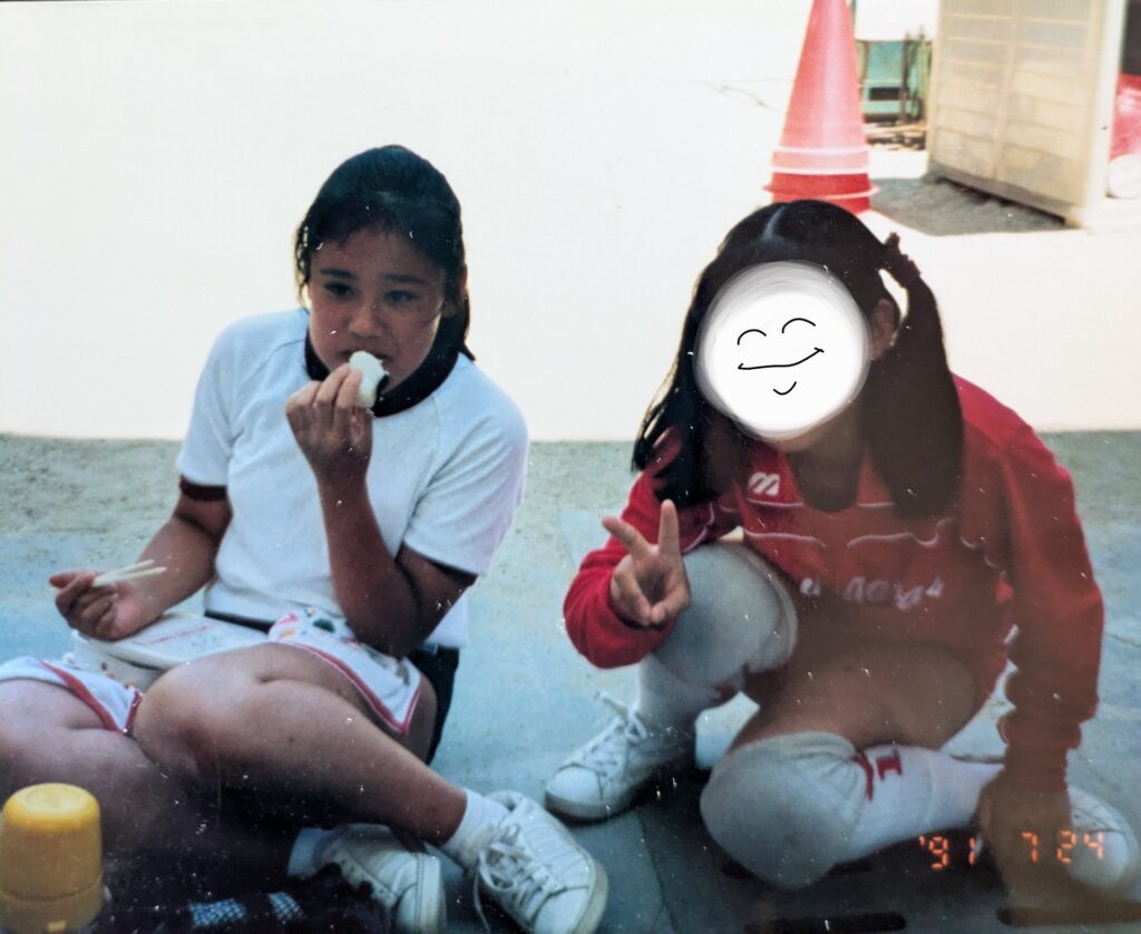 部活はバレー部だったので、隣に居るのは先輩で、確か試合で他の中学校に行った時のお昼休憩に撮った写真です。